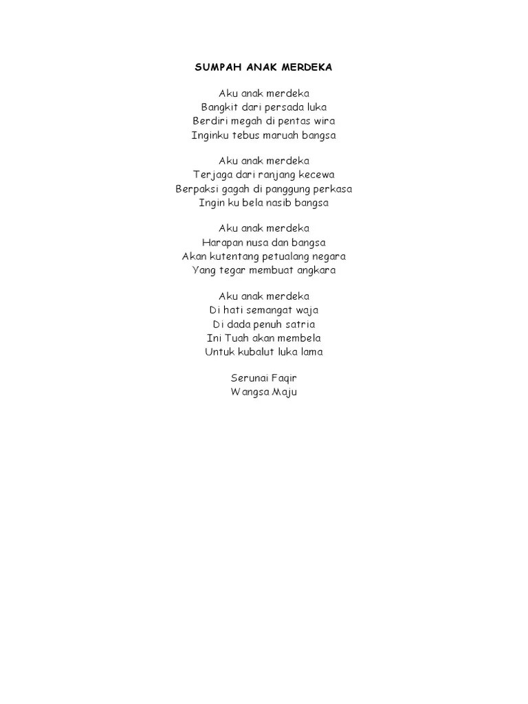 Anak Merdeka Sajak Sumpah Generasi Merdeka / Puisi Puisi Pilihan Untuk Pertandingan Deklamasi Puisi Sekolah Menengah Pdf Free Download. Terutama kepada generasi yang bakal mewarisi negara khususnya menjelang tahun 2020. Sajak sumpah anak merdeka englshsabur. Semangat kita wajar padu berjalan kita. Sumpah anak merdeka aku anak merdeka bangkit dari persada luka berdiri megah di pentas wira inginku tebus maruah bangsa. Atas nama tanah air dan bangsa. Antara bunga mimpi dan tragedi dalam membina generasi globalisasi Dalam nukilan sajak merdeka (2007) terhimpun 378 buah puisi.